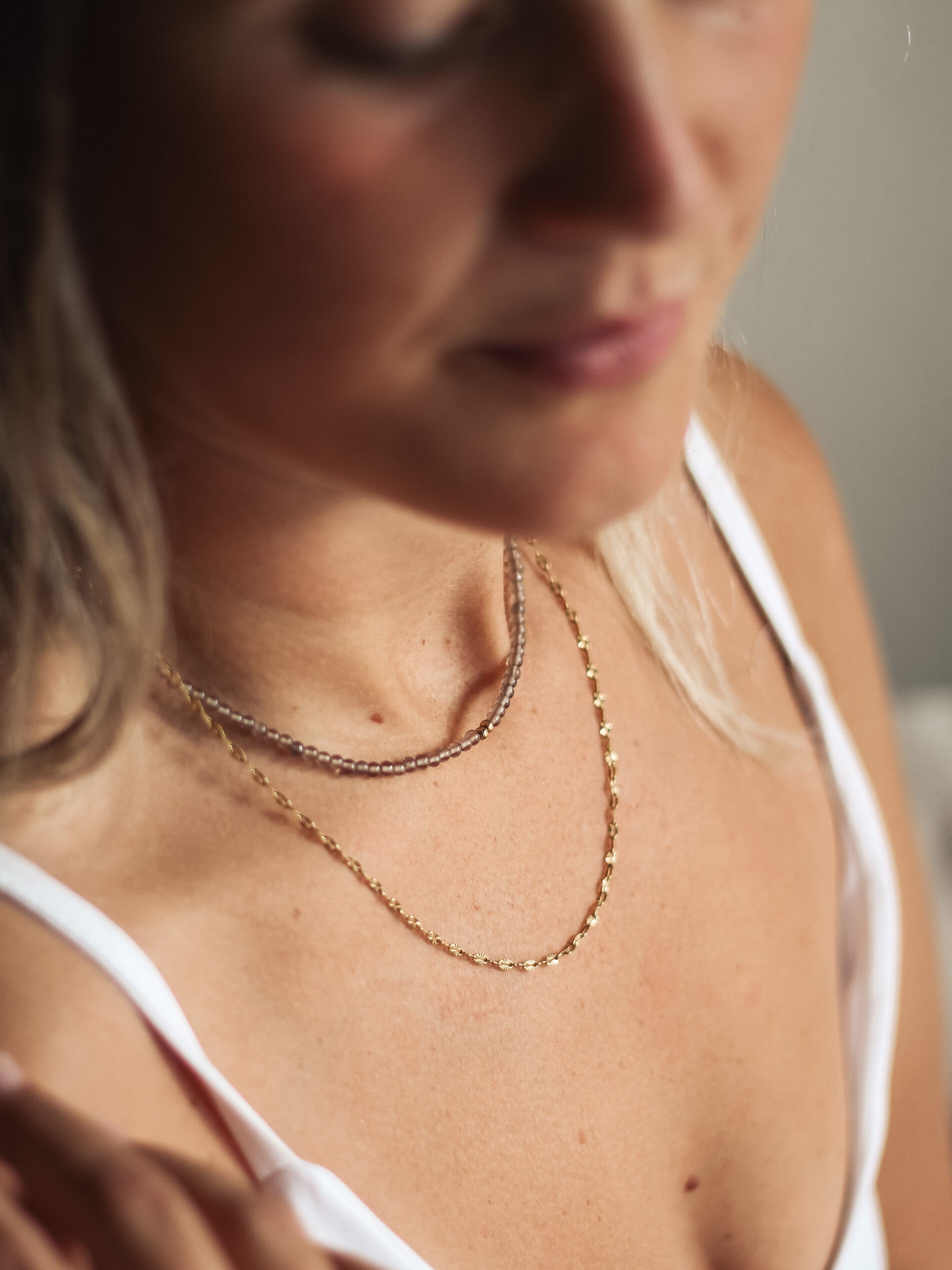 Een handgemaakte ketting met rookkwarts steentjes en roestvrij stalen details. Een subtiele ketting die mooi kort om je hals valt en daarmee perfect te combineren is met langere kettingen. De korte ketting is ongeveer 40-42 cm. Liever wat langer? Kies dan de 44 cm.