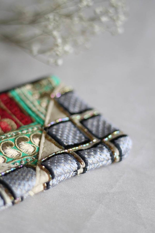 De etui is handgemaakt in India van mooie, rijke stof, afgewerkt met wat kraaltjes.