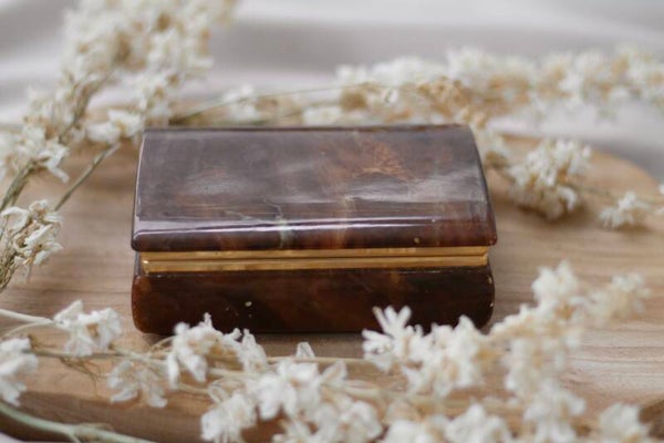 Dit elegante doosje van bruin albast doet nu dienst doet als sieradendoosje. Het gladde, gepolijste oppervlak en de natuurlijke kleurvariaties van het albast geven het een tijdloze schoonheid.