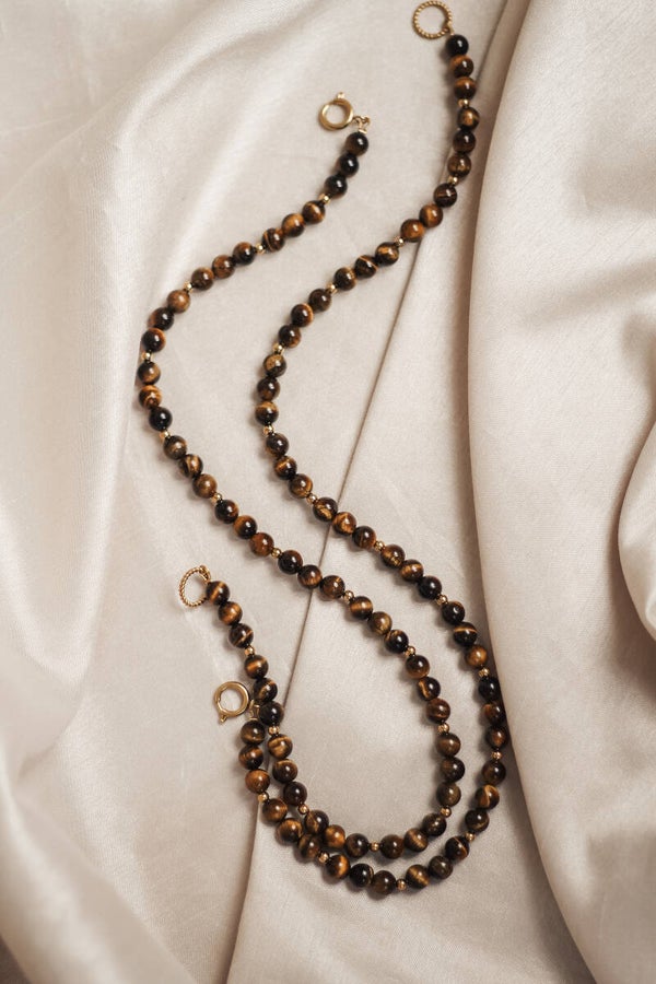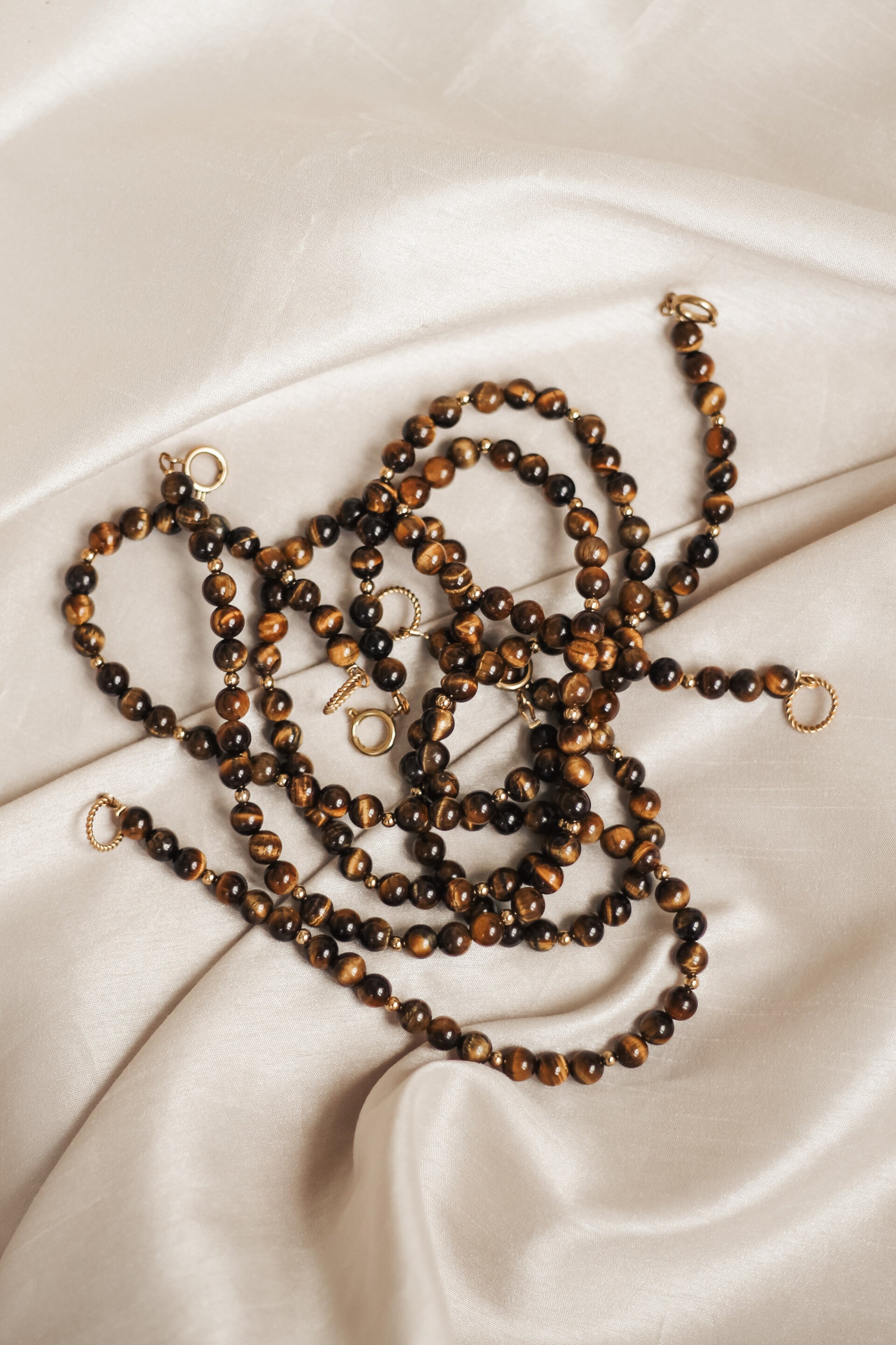 Deze handgemaakte ketting, gemaakt met tijgeroogkralen, straalt natuurlijke warmte en kracht uit. De kralen van tijgeroog tonen hun kenmerkende goudbruine glans en geven een tijdloze, aardse uitstraling, met tussen de edelstenen subtiele RVS kralen.