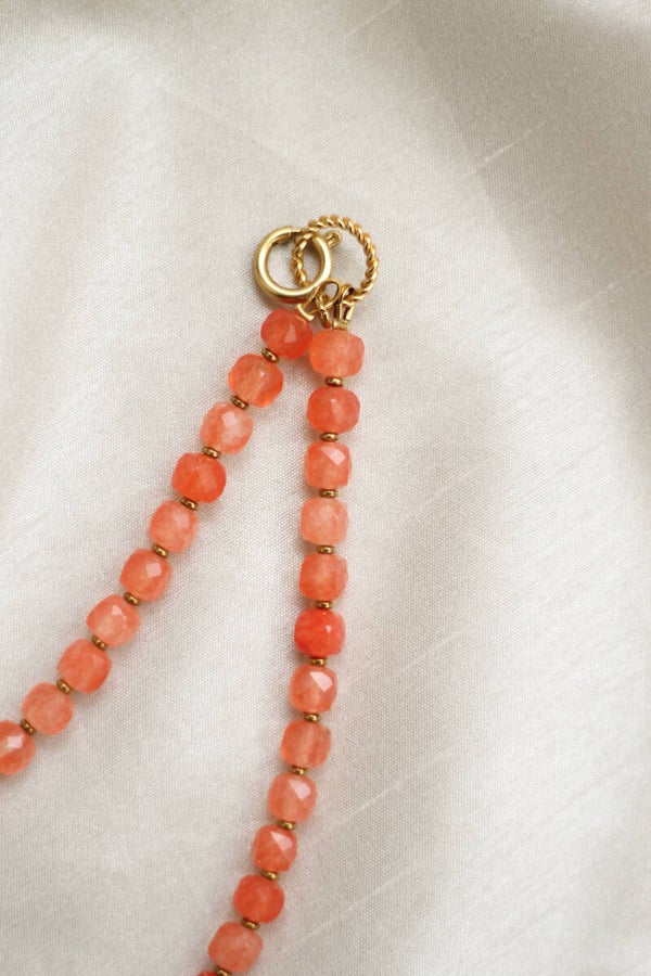 Deze verfijnde ketting is gemaakt van oranje aventurijn, gecombineerd met piepkleine hematietkraaltjes en afgewerkt met een elegant slotje. Met een lengte van 42 centimeter valt hij subtiel en vrouwelijk rond de hals.