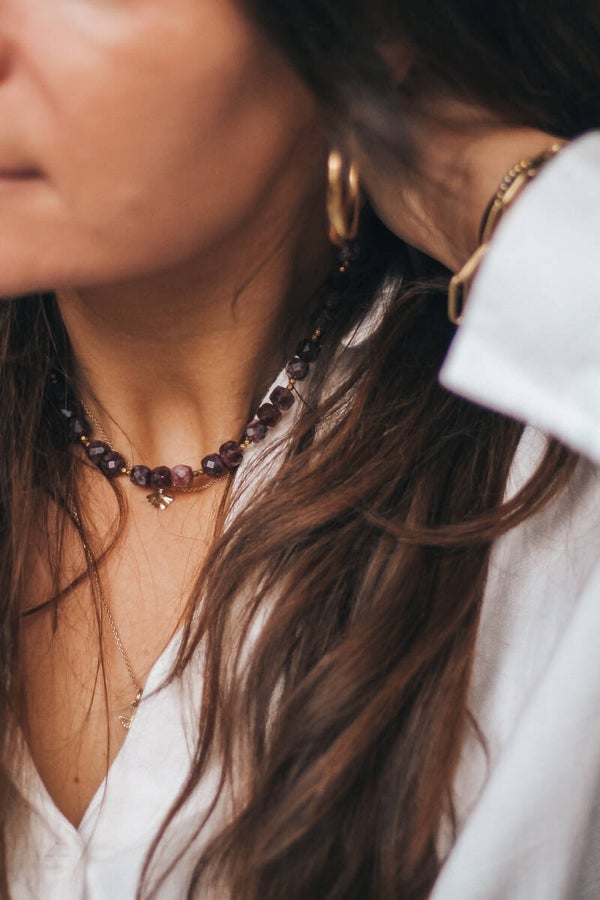 Deze ketting is geregen met facetgeslepen granaatsteentjes, die door hun vele kleine vlakjes prachtig het licht vangen. De diepe, wijnrode kleur van granaat geeft de ketting een warme, elegante uitstraling. Tussen de granaatsteentjes zijn kleine hematietkraaltjes verwerkt, die zorgen voor een subtiel metallic accent en een mooi ritme in het ontwerp.