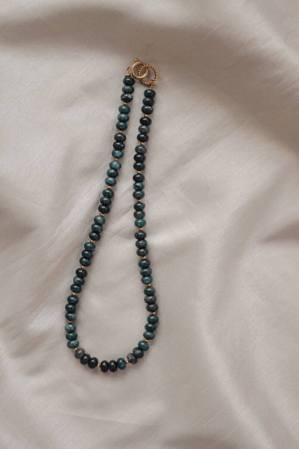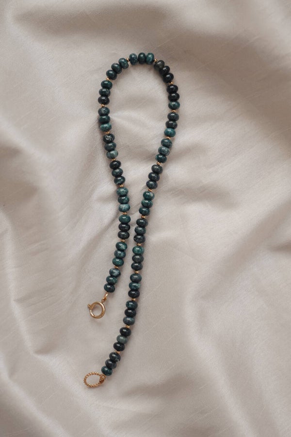 Deze ketting is met zorg geregen uit prachtige groene mos agaat kralen. De kralen hebben de vorm van kleine disks: rond, licht afgeplat en subtiel glanzend. Door hun natuurlijke groene tint straalt de ketting een zachte, aardse ele