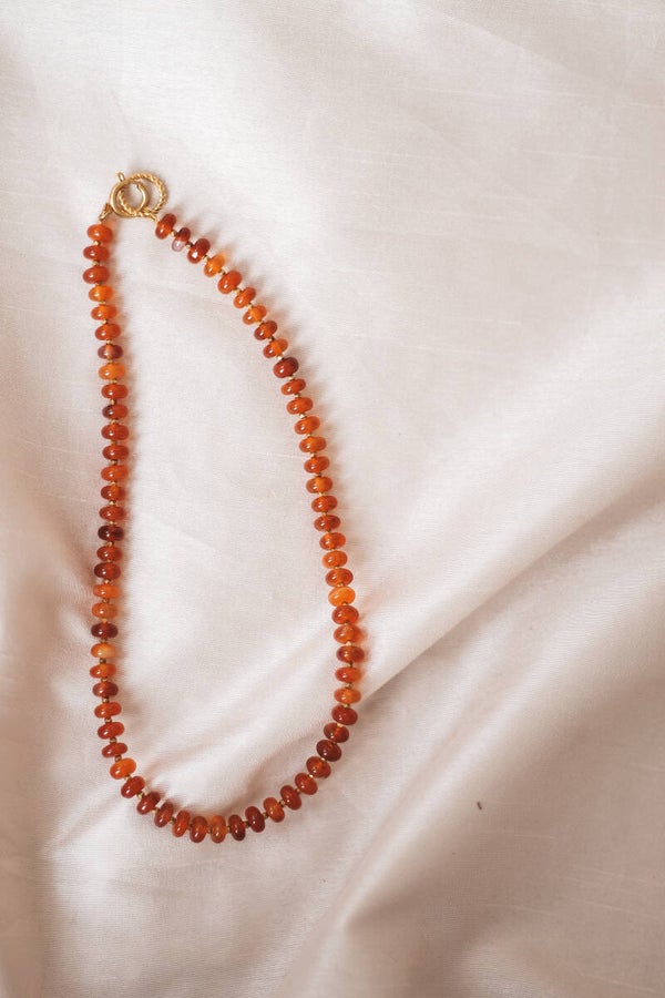 Deze ketting is gevuld met carneool disks, die variëren van warm oranje tot diep roodbruin. De natuurlijke glans van carneool geeft de ketting een levendige en toch zachte uitstraling, waardoor hij zowel speels als elegant oogt.